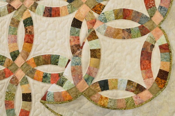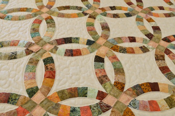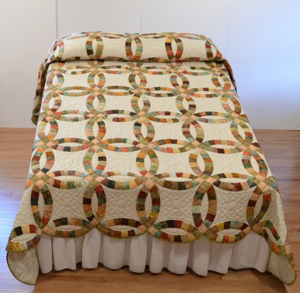 The intertwining circles created from curved pieces of fabric require a skilled seamstress, and the intricate hand-quilting exemplifies outstanding workmanship.