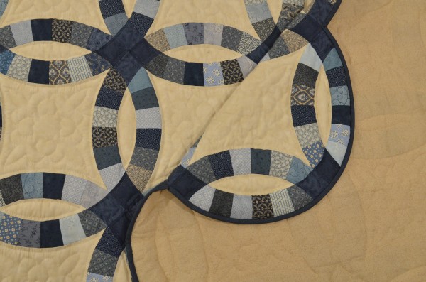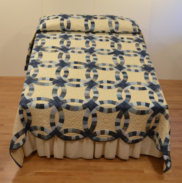 This traditional pattern is an elegant addition to any bedroom and is often gifted as a classic wedding or anniversary gift. The intertwining circles created from curved pieces of fabric require a skilled seamstress, and the intricate hand-quilting exemplifies outstanding workmanship.