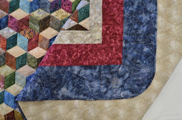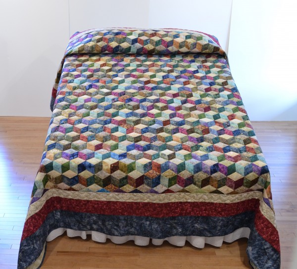 The expert shading in this quilt creates a 3-dimensional effect and the illusion of blocks falling across the bed. The Tumbling Block pattern can only be done well by an experienced seamstress, and the piecing of this traditional design is very precise. Each diamond has discreet hand-quilting all the way around, adding loft and dimension to the design.