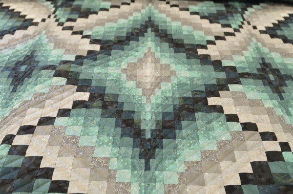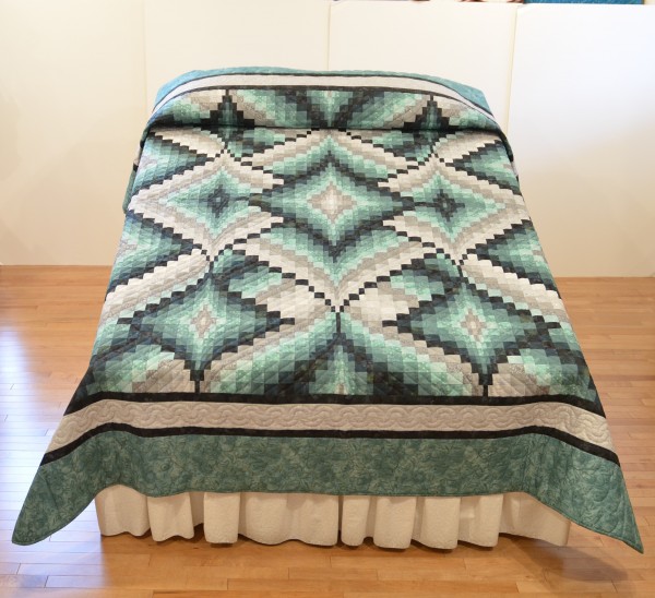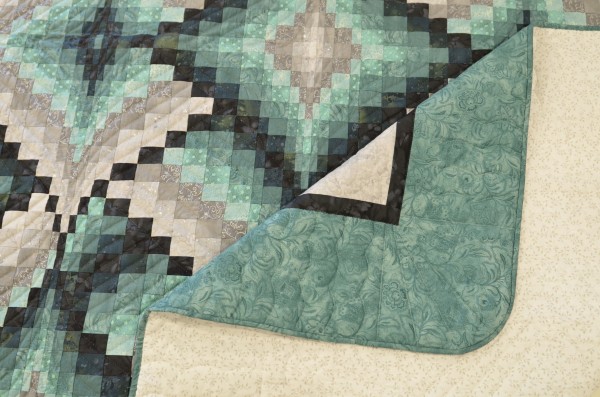 The shifting color values bring energy and excitement. Hand-quilting from corner-to-corner of each block enhances the design.