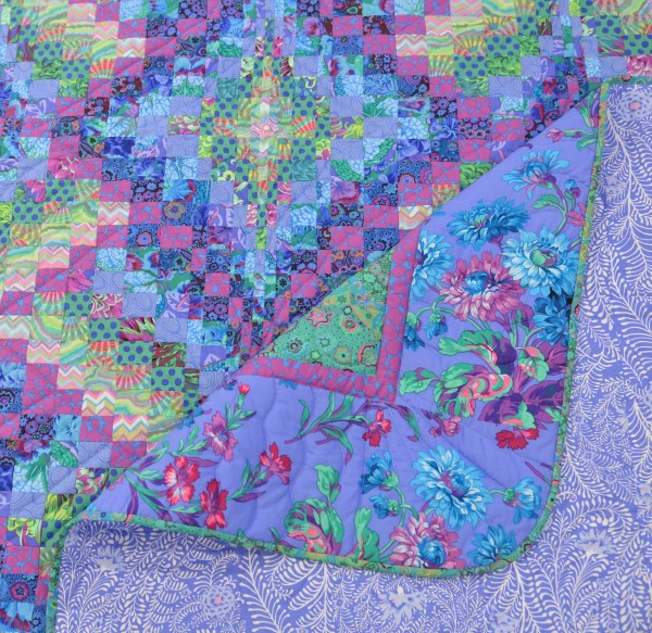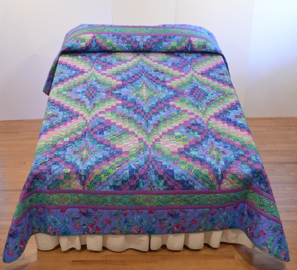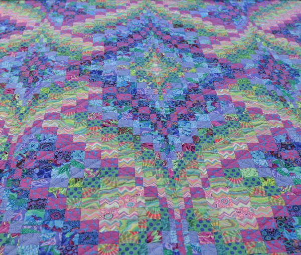 The shifting color values bring energy and excitement. Hand-quilting from corner-to-corner of each block enhances the design.