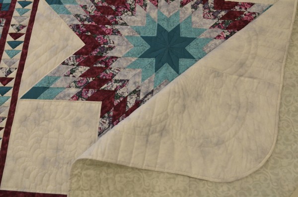 Here's an attractive variation of the Lone Star quilt design. This smaller star is contained within a Flying Geese border and a pieced block border.