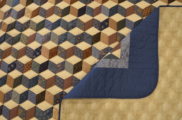 The expert shading in this quilt creates a 3-dimensional effect and the illusion of blocks falling across the bed. The Tumbling Block pattern can only be done well by an experienced seamstress, and the piecing of this traditional design is very precise. Each diamond has discreet hand-quilting all the way around, adding loft and dimension to the design.