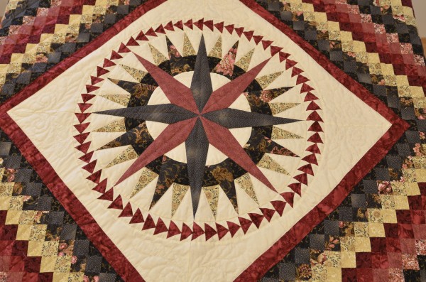 There are three popular quilt patterns in this lesser-known gem. In the center find the Mariner’s Compass star which is encased in a ring of Flying Geese triangles. The quilt’s center block is surrounded by a Trip Around the World block arrangement.