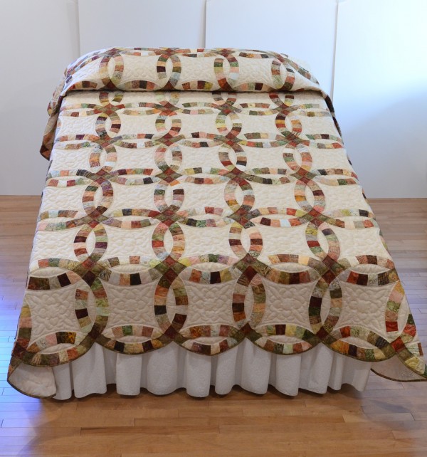 This traditional pattern is an elegant addition to any bedroom and makes a lovely gift. The intertwining circles created from curved pieces of fabric require a skilled seamstress, and the intricate hand-quilting exemplifies outstanding workmanship. The color choices in this beloved favorite make it a romantic choice. Hand-quilted by an Amish friend, Lancaster County, PA.