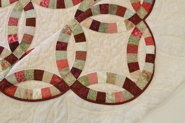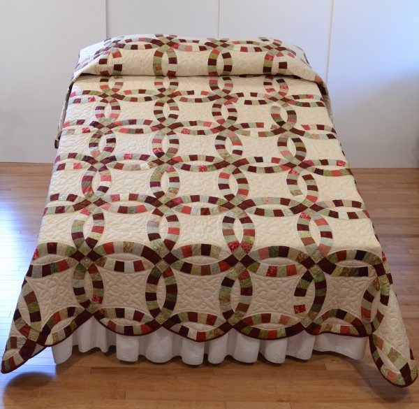 This traditional pattern is an elegant addition to any bedroom and makes a lovely gift. The intertwining circles created from curved pieces of fabric require a skilled seamstress, and the intricate hand-quilting exemplifies outstanding workmanship. The color choices in this beloved favorite make it a romantic choice. Hand-quilted by an Amish friend, Lancaster County, PA.