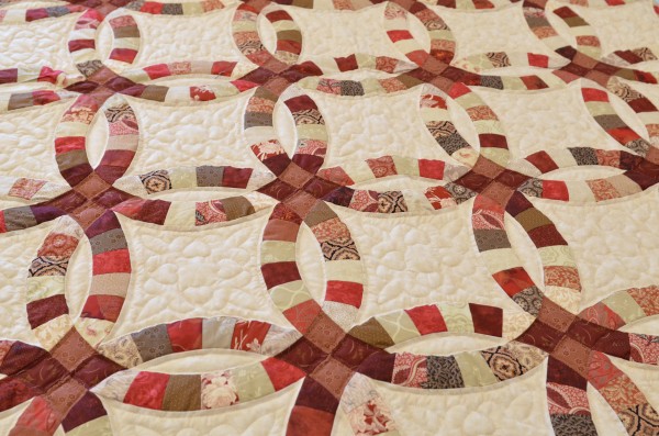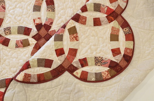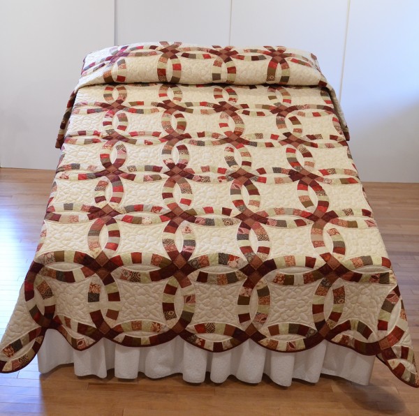 This traditional pattern is an elegant addition to any bedroom and makes a lovely gift. The intertwining circles created from curved pieces of fabric require a skilled seamstress, and the intricate hand-quilting exemplifies outstanding workmanship. The color choices in this beloved favorite make it a romantic choice. Hand-quilted by an Amish friend, Lancaster County, PA.