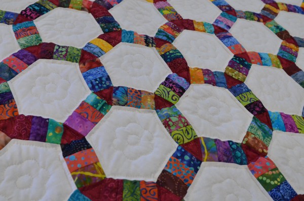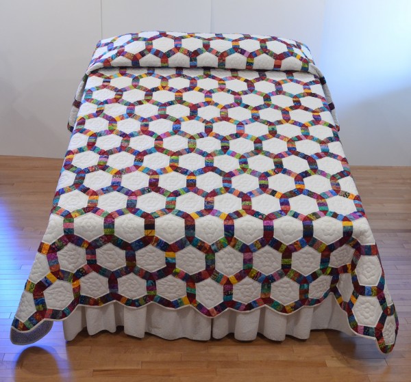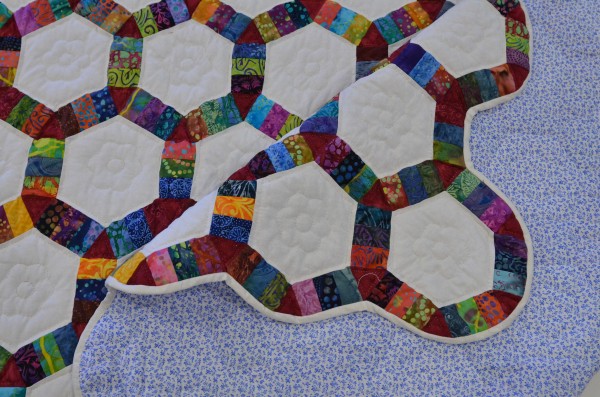This lesser-known pattern resembles the Double Wedding Ring, but is hexagon based. The rings chain and are made of pieced blocks. The design runs the full range of the quilt, resulting in an attractive, scallop-like edge.